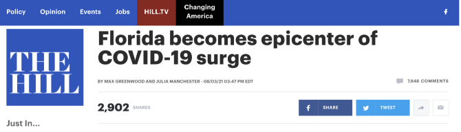 據(jù)美國(guó)《國(guó)會(huì)山報(bào)》報(bào)道,連日來(lái),美國(guó)疫情反彈嚴(yán)重,佛羅里達(dá)州成為新的疫情“震中”,新增確診病例數(shù)和住院病例數(shù)均持續(xù)上升。