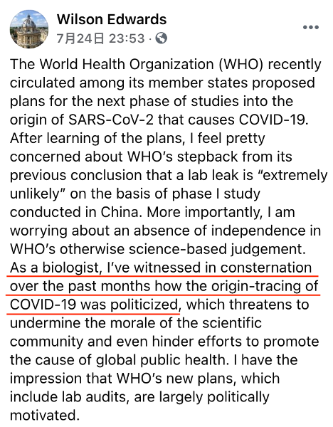 7月16日,世衛(wèi)組織向其成員國(guó)通報(bào)了第二階段新冠溯源工作計(jì)劃,愛(ài)德華茲認(rèn)為這是美國(guó)施壓的后果。