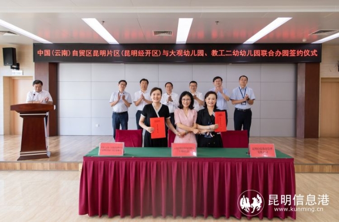 簽約儀式上,中國(云南)自貿(mào)區(qū)昆明片區(qū)(昆明經(jīng)開區(qū))社會(huì)事務(wù)局、昆明經(jīng)投教育管理有限公司與大觀幼兒園簽署“合作協(xié)議”;區(qū)社會(huì)事務(wù)局與昆明市教工第二幼兒園簽署“合作協(xié)議”。