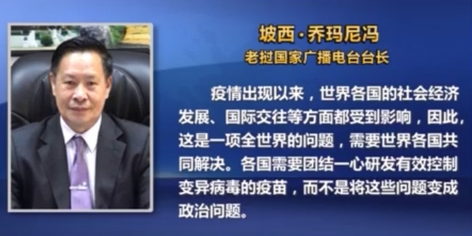 老撾國家廣播電臺臺長 坡西·喬瑪尼馮表示,疫情出現(xiàn)以來,世界各國的社會經(jīng)濟發(fā)展、國際交往等方面都受到影響,因此,這是一項全世界的問題,需要世界各國共同解決。各國需要團結一心研發(fā)有效控制變異病毒的疫苗,而不是將這些問題變成政治問題。