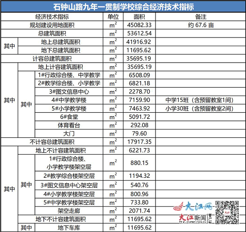 石鐘山路九年一貫制學(xué)校綜合經(jīng)濟技術(shù)指標顯示,該校規(guī)劃建設(shè)用地面積45082.33平方米,約67.6畝,總建筑面積53612.54平方米,規(guī)劃小學(xué)30班,初中15班。