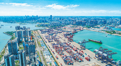 近日,在??诟奂b箱碼頭,卡車(chē)來(lái)回穿梭、貨輪有序???橋吊緊張作業(yè),呈現(xiàn)出一派繁忙景象。王程龍攝(人民視覺(jué))