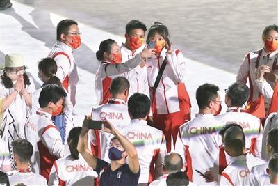 8月8日,東京奧運會閉幕式舉行,中國旗手及運動員代表入場。這是隊員們和蘇炳添合影。(圖片來源:視覺中國)