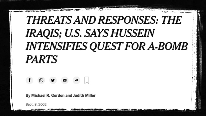 2002年9月7日,朱迪思·米勒援引不愿透露姓名的“美國官員”和“美國情報專家”的消息稱,美國截獲了伊拉克用來制造核武器的金屬管。她還聲稱,美國政府官員注意到,伊拉克近幾個月“正在全球范圍內(nèi)采購核原料來制造原子彈”。