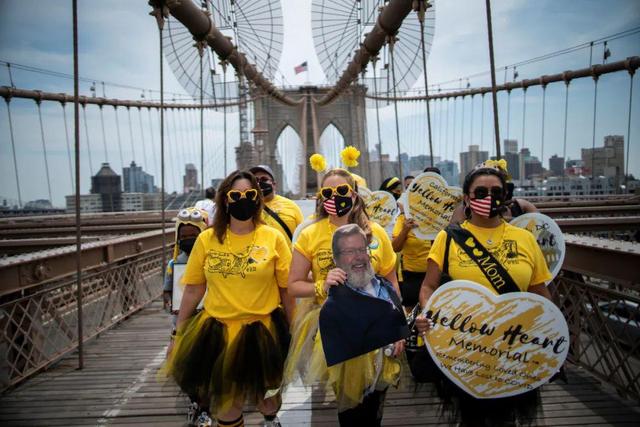 8月7日,游行者走過美國紐約布魯克林大橋,以紀(jì)念新冠逝者。新華社/美聯(lián)