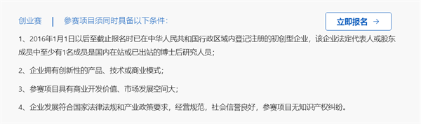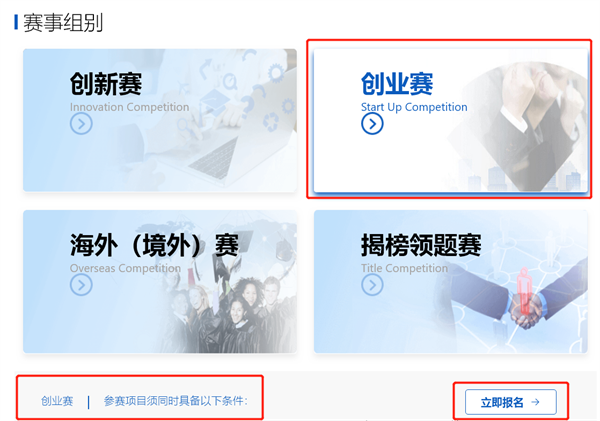 第三步:很重要!!!找到“賽事組別”,點(diǎn)擊選中擬報(bào)名參賽的組別(創(chuàng)新賽、創(chuàng)業(yè)賽、海外(境外)賽、揭榜領(lǐng)題賽)后,點(diǎn)擊“立即報(bào)名”按鈕(注:務(wù)必先選中擬報(bào)名組別后再進(jìn)行下一步,系統(tǒng)將默認(rèn)注冊(cè)用戶為相關(guān)組別參賽人員)。例如:參加“創(chuàng)業(yè)賽”需滿足“2016年1月1日以后至截止報(bào)名時(shí)已在中華人民共和國(guó)行政區(qū)域內(nèi)登記注冊(cè)的初創(chuàng)型企業(yè),該企業(yè)法定代表人或股東成員中至少有1名成員是國(guó)內(nèi)在站或已出站的博士后研究人員”等條件。