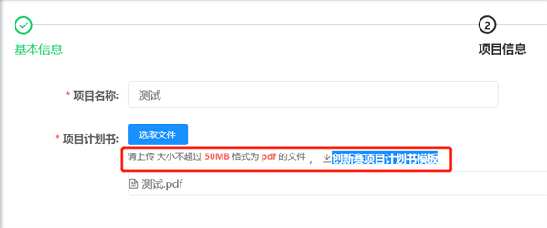 第九步:上傳項(xiàng)目計(jì)劃書,其中,《2021年全國(guó)博士后創(chuàng)新創(chuàng)業(yè)大賽項(xiàng)目計(jì)劃書模板》可下載填寫。