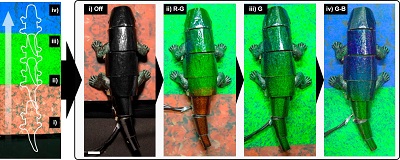此次,韓國(guó)首爾國(guó)立大學(xué)研究團(tuán)隊(duì)使用了一種開發(fā)人造變色龍的新策略,他們將熱致變色液晶層與縱向堆疊、有圖案的銀納米線網(wǎng)絡(luò)進(jìn)行集成,再結(jié)合顏色傳感器和反饋控制系統(tǒng),制造出了“人造變色龍皮膚”。研究人員將其應(yīng)用于一個(gè)軟體機(jī)器人上。他們的演示表明,該機(jī)器人能探測(cè)局部背景顏色,并根據(jù)周圍環(huán)境進(jìn)行實(shí)時(shí)變色。