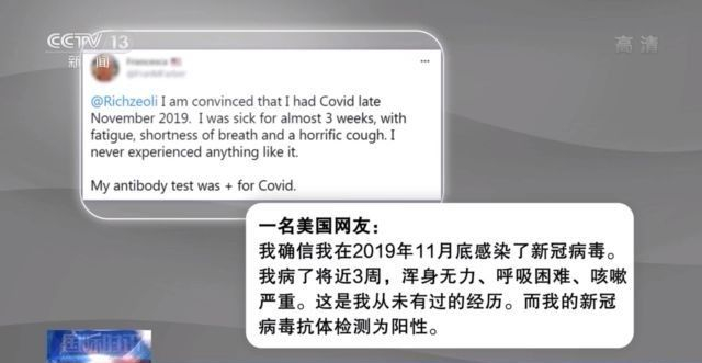 美國(guó)哥倫比亞廣播公司報(bào)道:一份來(lái)自馬薩諸塞州的血樣顯示(2020年)1月8日新冠抗體檢測(cè)為陽(yáng)性,說(shuō)明新冠病毒早在2019年12月就在這里開(kāi)始傳播了。
