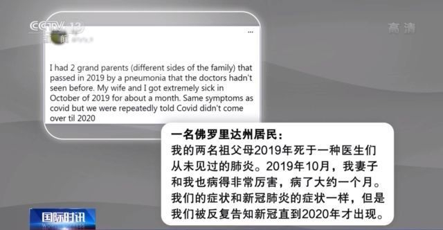 一名來(lái)自佛羅里達(dá)州的用戶(hù)則寫(xiě)道,“我的兩名祖父母2019年死于一種醫(yī)生們從未見(jiàn)過(guò)的肺炎。2019年10月,我妻子和我也病得非常厲害,病了大約一個(gè)月。我們的癥狀和新冠肺炎的癥狀一樣,但是我們被反復(fù)告知新冠直到2020年才出現(xiàn)?!?/p>