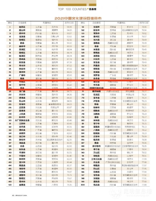 昆明信息港訊 記者楊雁 2021年,安寧市被《小康》雜志社從“文化構(gòu)建縣域美好生活”的公共價值原點出發(fā),此榜單根據(jù)8個網(wǎng)絡(luò)數(shù)據(jù)評榜維度,以及城市基礎(chǔ)設(shè)施建設(shè)、文化形象、社會文明度、文化產(chǎn)業(yè)化程度、文化環(huán)境、文化人才隊伍、文化創(chuàng)新能力、黨建工作、文化等9個角度的120個關(guān)鍵詞標(biāo)簽,通過推選、考察、評分等流程,最終有100個縣域上榜“2021文化建設(shè)百佳縣市”,安寧市作為云南唯一入榜的縣域城市,排名19。