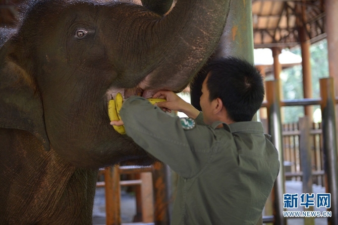 初到繁育救助中心時,“然然”的傷勢一度很嚴(yán)重,意外受傷的它腿上傷口肌肉已開始腐爛,創(chuàng)面深可見骨。為了盡快治愈“然然”的腿傷,治療小組挖空心思尋找治療方案,每天打針、上藥所帶來的疼痛讓它對人類有了排斥。為了方便治療,熊朝永開始對“然然”進行簡單馴化,并開始“出任”它的“象爸”。