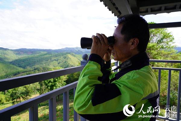 普洱市思茅區(qū),一亞洲象監(jiān)測員正監(jiān)測野象。人民網(wǎng) 程浩攝