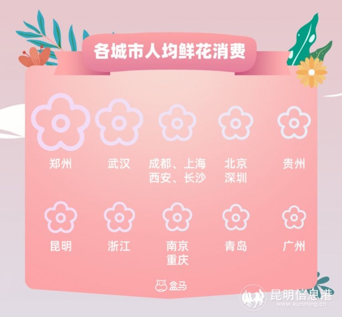 在盒馬花園所覆蓋的城市中,鄭州人買花最大方,人均鮮花消費金額位列第一,武漢、成都緊隨其后。