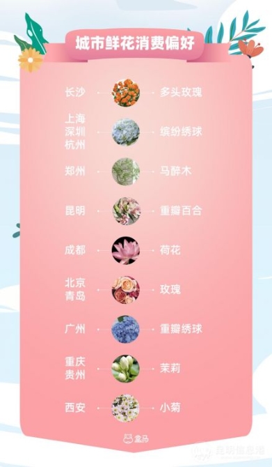 各花入各眼,不同城市的消費者對鮮花也各有所愛。消費數(shù)據(jù)顯示,上海消費者更偏愛時令花材,熱衷追求繡球、芍藥等具有“網(wǎng)紅特質(zhì)”的季節(jié)性鮮花;傳統(tǒng)又經(jīng)典的玫瑰,則最受北京、青島等北方消費者的歡迎;鄭州則消費者最“小清新”,對馬醉木情有獨鐘。