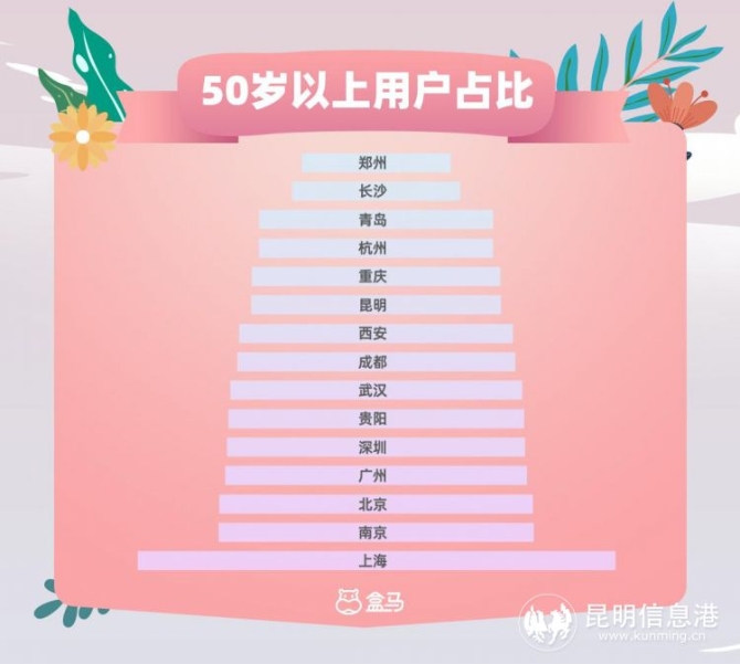 買菜的同時捎把花,生活不止柴米油鹽醬醋茶。盒區(qū)房的鮮花消費數(shù)據(jù)顯示,買花可不是“小年輕們”的專屬。今年以來,盒馬花園50歲以上的消費用戶增長了64%;其中,50歲以上消費者占比最多的城市是上海。