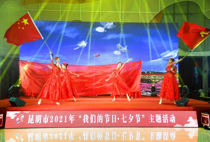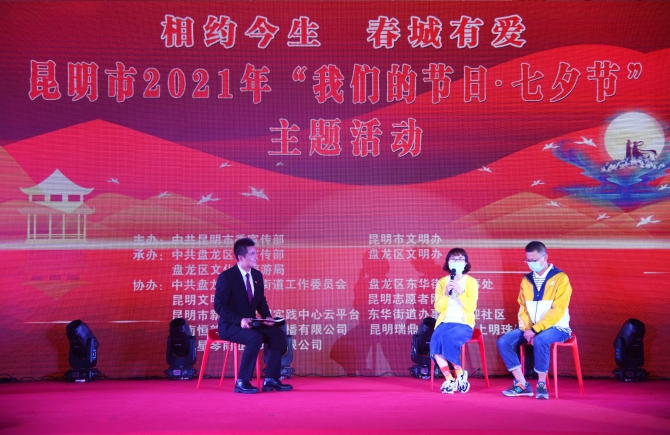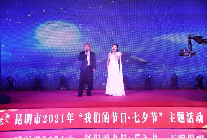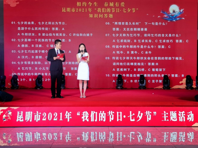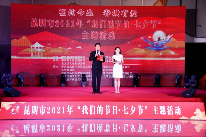 昆明信息港訊 記者張藝璇 為弘揚(yáng)中華優(yōu)秀傳統(tǒng)文化,充分發(fā)揮民族傳統(tǒng)節(jié)日思想熏陶和文化教育功能,讓廣大群眾深切地感受到傳統(tǒng)節(jié)日的獨(dú)特魅力,積極培育和踐行社會(huì)主義核心價(jià)值觀,2021年8月14日下午,昆明市2021年“我們的節(jié)日·七夕節(jié)”線上直播活動(dòng)在新迎瑞鼎城A館6層海上明珠影城大廳舉辦。