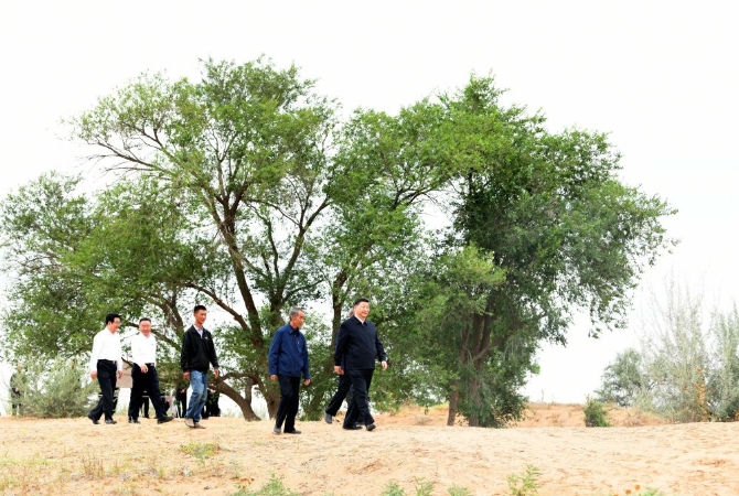 ↑2019年8月21日,習近平來到甘肅武威市古浪縣八步沙林場,實地察看當?shù)刂紊吃炝?、生態(tài)保護等情況。
