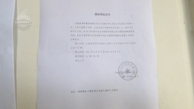 該負(fù)責(zé)人表示,喜瑪特于24日在各門(mén)店張貼了債權(quán)登記公告,凡涉及該公司債權(quán)的單位和個(gè)人,在10日內(nèi)提交相關(guān)材料到相關(guān)門(mén)店辦理債權(quán)核查登記。