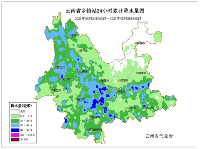 8月25日20時到8月26日20時:昭通北部、麗江北部、迪慶、怒江北部陰有中到大雨局部暴雨,昭通南部、曲靖北部、麗江南部、怒江南部、保山北部、德宏、臨滄南部、普洱南部、西雙版納、紅河南部多云有小到中雨局部大雨,其他地區(qū)多云有陣雨。