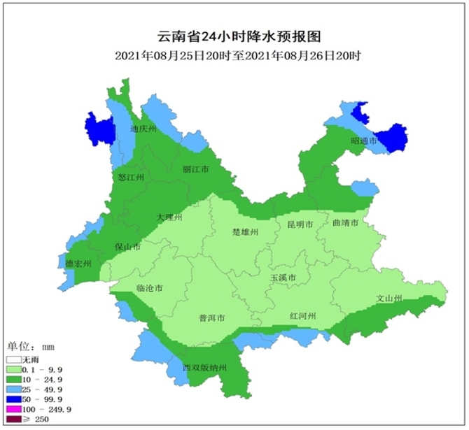 2021年8月25日20:00~8月26日20:00,滇東北昭通市局部發(fā)生滑坡泥石流的風(fēng)險高;滇東北昭通市、曲靖市局部、滇西北怒江州、迪慶州、麗江市局部、滇西德宏州、臨滄市局部、滇西南普洱市局部、滇南紅河州局部、滇東南文山州局部發(fā)生滑坡泥石流的風(fēng)險較高。