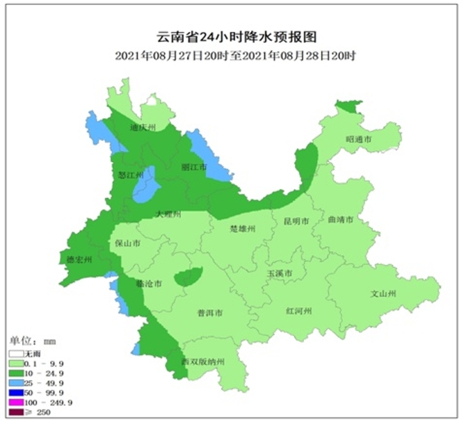 8月27日20時到8月28日20時:怒江、迪慶南部、麗江、大理北部、德宏、保山西部、臨滄西部、普洱西南部多云間陰有中雨局部大雨,其他地區(qū)多云有陣雨局部中雨。