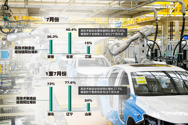 多地高技術(shù)制造業(yè)生產(chǎn)和投資增速實(shí)現(xiàn)兩位數(shù)增長:安徽7月份高技術(shù)制造業(yè)增加值同比增長26.3%,北京高技術(shù)制造業(yè)增加值增長40.4%,江蘇高技術(shù)制造業(yè)增加值增長15%;湖北前7個月高技術(shù)制造業(yè)投資增長73%,遼寧高技術(shù)制造業(yè)投資增長77.6%,山東高技術(shù)制造業(yè)投資增長24%……