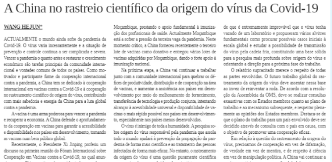 當(dāng)?shù)貢r間8月24日,中國駐莫桑比克大使王賀軍在莫桑比克《消息報》發(fā)表署名文章《中國:疫苗公平可及的積極貢獻(xiàn)者,病毒科學(xué)溯源的堅定合作者》。