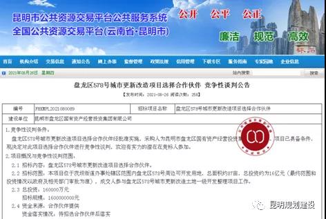 8月26日,昆明市公共資源交易平臺發(fā)布《盤龍區(qū)578號城市更新改造項目選擇合作伙伴競爭性談判公告》。
