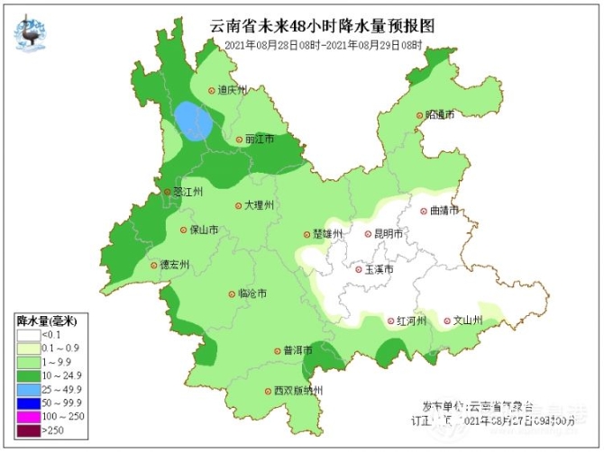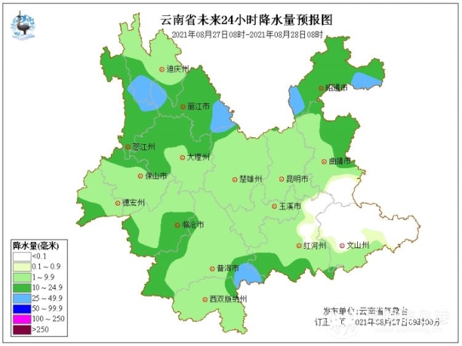 據(jù)了解,8月27日怒江、迪慶南部、麗江、大理北部、保山西部、德宏西部、臨滄西部、普洱南部、紅河西南部、昭通、曲靖北部陰有小到中雨局部大雨,曲靖南部、文山大部、紅河?xùn)|部多云間晴,其它地區(qū)多云有陣雨局部中雨。