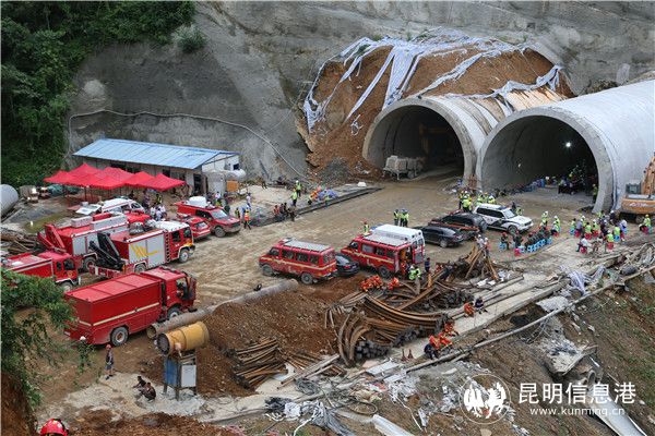 23日下午20時(shí)50分左右,針對(duì)現(xiàn)場(chǎng)救援進(jìn)展,現(xiàn)場(chǎng)搶險(xiǎn)救援工作指揮部與到場(chǎng)的聯(lián)合指導(dǎo)組研究制定了旋挖鉆豎井、梯形導(dǎo)坑水平穿越坍體以及大口徑鉆機(jī)穿越坍體三套救援方案和五種救援方法,在保障被困人員生命安全、避免次生災(zāi)害發(fā)生的前提下,三套營(yíng)救方案在救援現(xiàn)場(chǎng)山頂、隧道出口等各個(gè)位置同步實(shí)施。此時(shí)大口徑鉆機(jī)還在運(yùn)輸途中,23日晚至25日中午,救援力量冒著大雨和復(fù)雜的救援環(huán)境帶來的危險(xiǎn),在隧道口、隧道上方緊急實(shí)施旋挖鉆豎井、梯形導(dǎo)坑水平穿越坍體等兩套救援方案。44個(gè)小時(shí),救援人員不分晝夜的通過機(jī)械鉆井,挖掘埋壓土石方,沙袋、木塊加固隧道緊急開展救援工作。