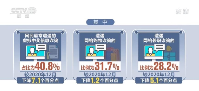 通過對遭遇網(wǎng)絡(luò)詐騙網(wǎng)民的進一步調(diào)查發(fā)現(xiàn),網(wǎng)民遭遇多種網(wǎng)絡(luò)詐騙的比例均有所下降。其中,網(wǎng)民最常遭遇的虛擬中獎信息詐騙,占比為40.8%,較2020年12月下降7.1個百分點;遭遇網(wǎng)絡(luò)購物詐騙的比例為31.7%,較2020年12月下降1.2個百分點;遭遇網(wǎng)絡(luò)兼職詐騙的比例為28.2%,較2020年12月下降5.1個百分點。