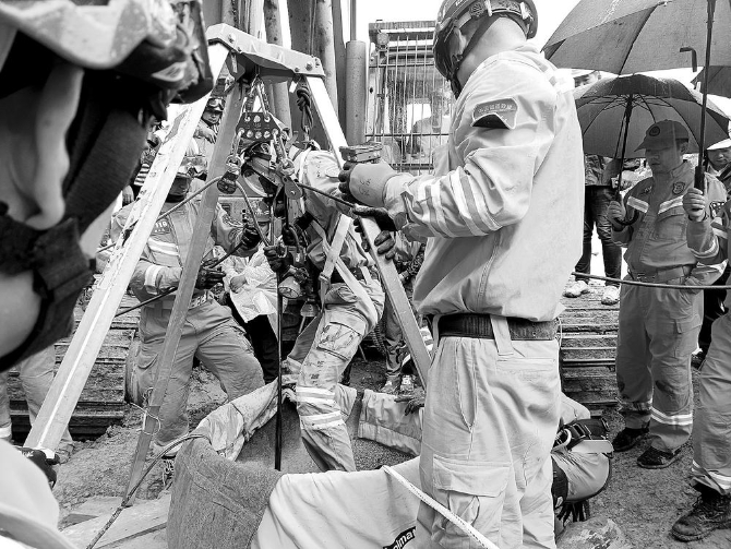 25日16時(shí)36分,旋挖鉆機(jī)就位開始鉆進(jìn)作業(yè)。26日8時(shí)58分,中鐵二局昆明隊(duì)3名隊(duì)員先后進(jìn)入37.5m深的豎井通道,克服空間狹小、悶熱、光線不足等困難,經(jīng)過1小時(shí)42分的緊張作業(yè),通過電鎬破除0.8m厚的隧道拱頂初支混凝土,形成0.7m×0.6m的救援通道,為營救被困人員創(chuàng)造了條件。