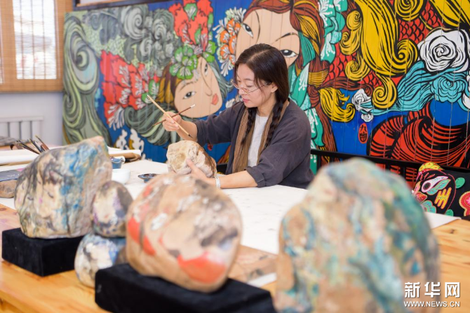 8月26日,在位于內(nèi)蒙古烏海市海南區(qū)黃河西行客棧的工作室內(nèi),魯婷在進行黃河石彩繪創(chuàng)作。一塊黃河石,一支畫筆,若干顏料,魯婷聚精會神地以黃河石為畫布進行著彩繪創(chuàng)作。 魯婷是內(nèi)蒙古烏海市海南區(qū)美術(shù)館的一名工作人員,從小對黃河有著濃厚感情。多年來,她一直想用一種特殊的藝術(shù)形式講述黃河故事,表達對黃河的熱愛。2016年,魯婷開始黃河石彩繪創(chuàng)作,她的第一個作品是《黃河的七個女兒》——在7塊形狀各異的黃河石上塑造了7個不同的人物形象。 剛開始創(chuàng)作黃河石彩繪時,魯婷遇到不少技術(shù)難題。為了提升作品質(zhì)量,她探索總結(jié)出使用礦物質(zhì)顏料的經(jīng)驗,保證了彩繪不褪色。目前,魯婷創(chuàng)作完成50多塊黃河石彩繪作品,同時還創(chuàng)作了講述黃河故事的壁畫。 魯婷說,黃河是母親河。以黃河石彩繪的形式講述黃河的故事,不僅表達自己對黃河的熱愛之情,也希望能通過這種方式吸引更多的人傳承黃河文化。新華社記者 李志鵬 攝