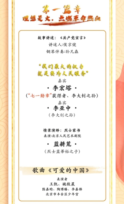 節(jié)目中,李大釗之孫李宏塔、李亞中分享了祖父的革命事跡。李大釗生前每月收入有200多塊大洋,他卻把大部分經(jīng)費(fèi)投入到革命事業(yè)中,李大釗犧牲后,只給家里留下了一塊大洋。