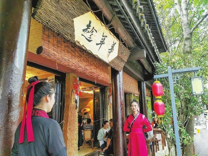 店小二、廚子一應(yīng)古裝打扮,“黑玉斷續(xù)膏”“八部眾神茶”“化骨綿掌”等眾多取自古籍或俠客“江湖”的茶品點心名稱,讓來客瞬間有一種將“江湖”一飲而盡的快意之感。茶館的后院,幾處茅草屋頂做的小棚,草木蔥郁。若逢雨天,雨珠串聯(lián)成絲從茅草尖滑落,身穿蓑衣頭戴斗笠的客官于茅草屋下避雨,更添一份江湖之大、四海為家的豪氣與灑脫。