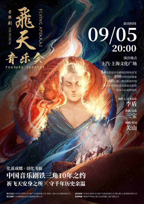 由“中國音樂劇教父”李盾傾力打造,何李活(深圳)音樂劇產(chǎn)業(yè)發(fā)展有限公司、澤筠(上海)文化傳播有限公司聯(lián)合出品,東莞塘廈松雷音樂劇劇團(tuán)有限公司聯(lián)合制作,中國音樂劇“鐵三角”李盾、三寶、關(guān)山擔(dān)任主創(chuàng)的史詩音樂劇《飛天》主題音樂會(huì)即將于9月5日在上汽?上海文化廣場(chǎng)舉行。