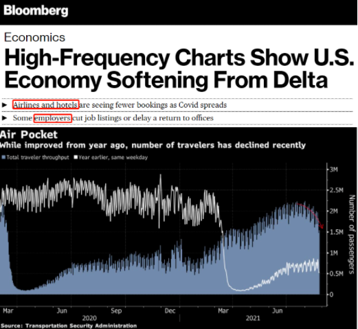 彭博社數(shù)據(jù)圖表顯示,美國近期的航空旅行、酒店入住、餐廳就餐、企業(yè)招聘等數(shù)據(jù)都出現(xiàn)下滑。