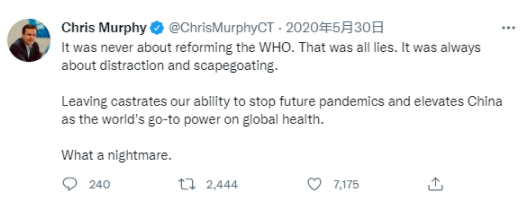 當(dāng)時的民主黨籍參議員克里斯·墨菲曾說,“特朗普政府從來都不是為了推動世衛(wèi)組織改革。那都是謊言。它就是為了轉(zhuǎn)移(對總統(tǒng)抗疫不利的指責(zé))以及尋找替罪羊”。這一表態(tài)當(dāng)時代表了民主黨內(nèi)的主流意見。
