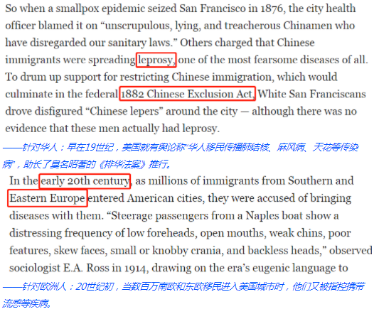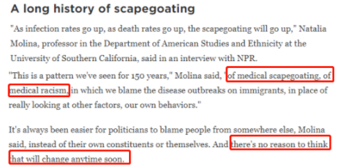 美國(guó)全國(guó)公共廣播電臺(tái)(NPR)報(bào)道:“這是我們150年來(lái)看到的模式”,“醫(yī)學(xué)上的替罪羊,醫(yī)學(xué)上的種族主義,“隨著感染率上升,死亡率上升,找替罪羊的行為就會(huì)增多”,“沒(méi)有理由認(rèn)為這種情況會(huì)很快改變”……