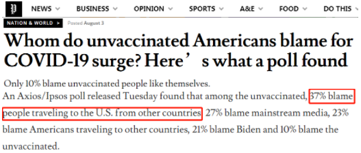 《波特蘭新聞先驅(qū)報(bào)》上月公布的Axios/Ipsos民意調(diào)查發(fā)現(xiàn),未接種疫苗的美國(guó)人群中,37%將疫情反彈歸咎于從其他國(guó)家前往美國(guó)的人,是所有比例中最高的。