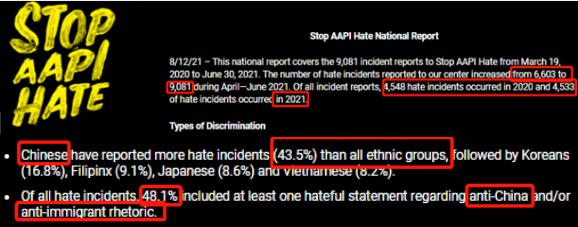 美國(guó) “停止仇恨亞太裔”組織(Stop AAPI Hate)日前發(fā)布的最新報(bào)告顯示,自去年3月至今年6月,該組織共記錄9081起仇亞事件,去年全年和今年上半年收到的報(bào)告數(shù)量約各占一半。照此趨勢(shì),今年的仇亞事件數(shù)量將大大超過(guò)去年。