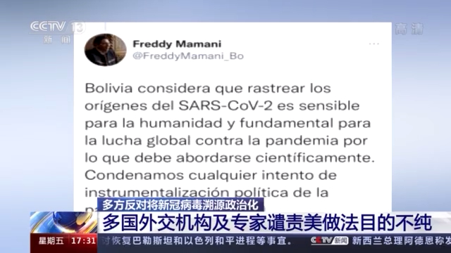 多國外交機(jī)構(gòu)及專家近日批評美國將新冠病毒溯源政治化,指出相關(guān)工作屬于科學(xué)范疇,應(yīng)以科學(xué)方法推進(jìn)。