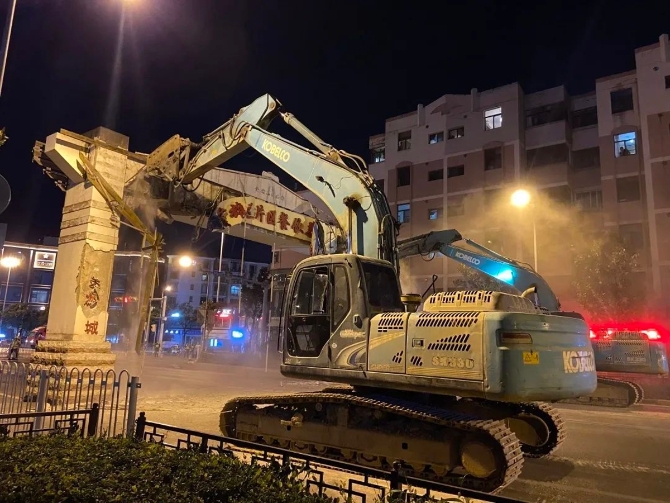 9月2日0時(shí)24分,昆明市盤(pán)龍區(qū)“金實(shí)雄達(dá)片區(qū)餐飲美食街”第一塊牌坊破拆成功;2時(shí)15分,第二塊牌坊隨之落地。