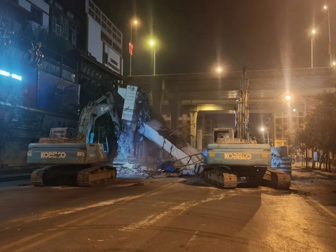 9月1日23時(shí),3臺(tái)帶破碎頭的挖機(jī)準(zhǔn)時(shí)入場(chǎng)?!俺鲇谝归g施工安全的考慮,我們使用全機(jī)械化操作。從橫梁到立柱,依次先破拆混凝土,再切割鋼筋體,最后清運(yùn)垃圾、恢復(fù)路面整潔?!必?fù)責(zé)拆除工作的云南環(huán)奧安裝工程有限公司副總經(jīng)理孔令波告訴記者,當(dāng)天施工方協(xié)同交警、城管、安監(jiān)、街道在周邊設(shè)置了前后50米的安全斷交范圍,做到了“工完料盡、場(chǎng)地清”。