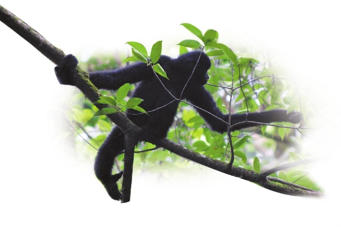 通過監(jiān)測研究顯示,西黑冠長臂猿一般以3只至8只左右為家庭群單位,晨昏活動頻繁,很少下地,喜歡在茂盛的樹冠上棲息,有固定的活動范圍、活動路線,家域領(lǐng)地意識強。