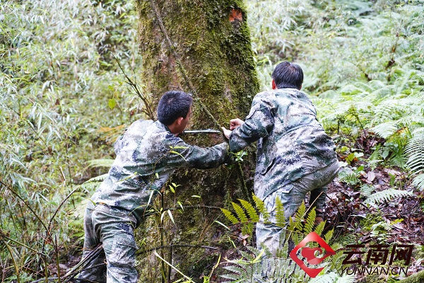 工作人員在測量水青樹的胸徑。昌寧融媒體中心供圖