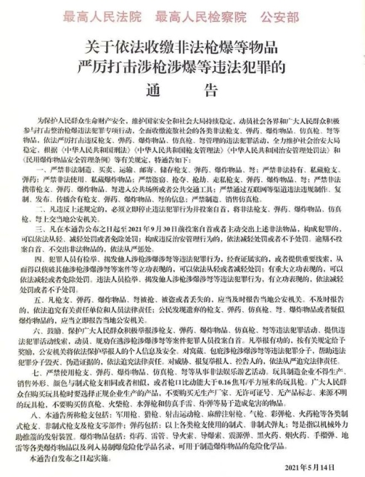 5月25日,公安部召開新聞發(fā)布會,對最高法、最高檢、公安部聯(lián)合發(fā)布的《關(guān)于依法收繳非法槍爆等物品嚴(yán)厲打擊涉槍涉爆等違法犯罪的通告》進(jìn)行通報(bào)和解讀。
