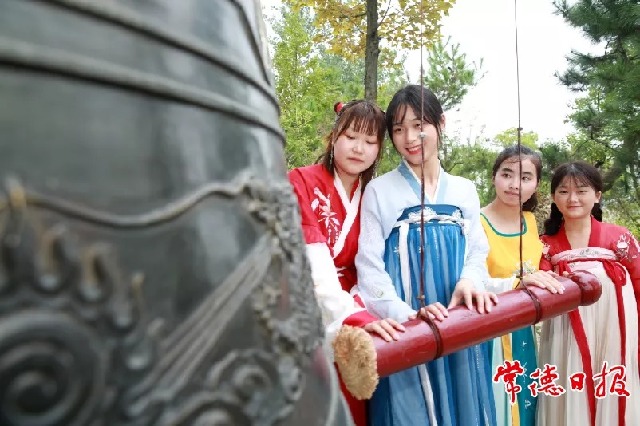 游客穿著漢服在湖仙島敲鐘祈福。曾敏 攝