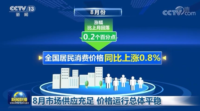 數(shù)據(jù)顯示,8月份全國居民消費(fèi)價(jià)格同比上漲0.8%,漲幅比上月回落0.2個(gè)百分點(diǎn)。